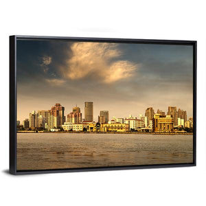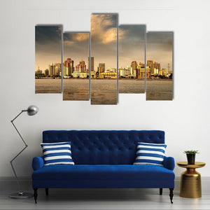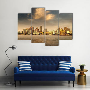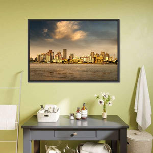 This captivating canvas wall art features a serene city skyline at sunset, reflecting on calm waters. The warm palette of blue, orange, tan, and grey creates an atmospheric ambiance, perfect for adding a tranquil touch to your space.
