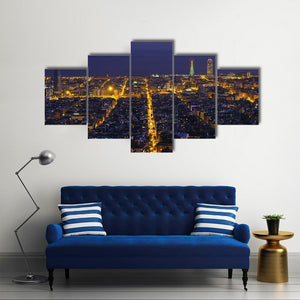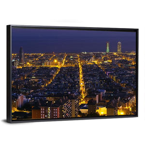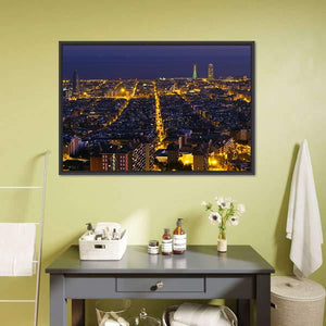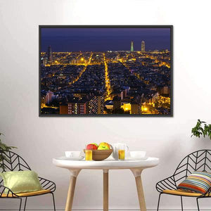 This vibrant canvas art captures the dynamic city skyline of Barcelona after dusk. Featuring illuminated buildings and tall towers, it brings an energetic urban feel to any space.