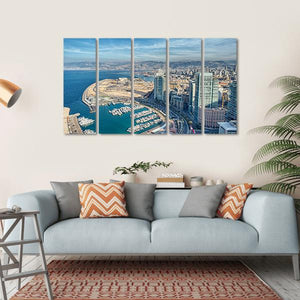 This vibrant canvas art captures the dynamic cityscape of Beirut, showcasing a stunning high-angle view of the marina and harbor. The palette of blue, green, and grey highlights boats docked in the harbor and tall buildings under a bright sky, making it a perfect addition to your modern decor.