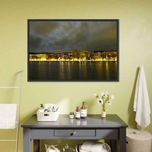 This captivating canvas print features the serene cityscape of Copenhagen at night, showcasing buildings reflecting beautifully on the waterfront. With a modern style and a calming palette of dark blue, yellow, and grey, it's an ideal addition to any wall.