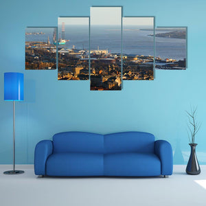This canvas wall art captures an aerial view of Dundee's vibrant cityscape, featuring its bustling harbor and industrial structures. The realistic portrayal in shades of blue, gray, and brown evokes an expansive and distant feel, making it a striking addition to any wall decor.