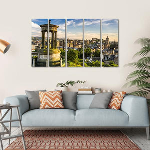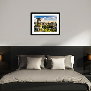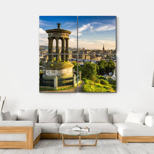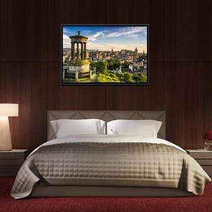 This canvas art captures a picturesque view of Edinburgh, showcasing a historic round stone monument with elegant columns against a backdrop of blue skies and green trees. With its photorealistic style, it brings warmth and charm, making it a delightful addition to any space.