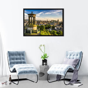 A panoramic photographic view of Edinburgh’s historic cityscape, centered on a Grecian-style monument with columns and a dense spread of spires against rolling hills. Rendered in a realistic style with a golden-blue palette and late-afternoon light, the piece brings a serene, majestic atmosphere that suits living rooms or studies with modern decor.