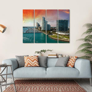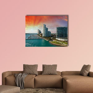 Capture the vibrant skyline of Miami with this stunning canvas art piece. Showcasing a serene sunset over the harbor, the artwork features majestic modern high-rise buildings and numerous docked yachts, all bathed in warm orange and calming blue tones. Ideal for adding a lively touch to your home decor.