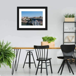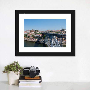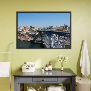City Of Portugal Panoramic Canvas depicts a photorealistic city skyline with a river, domed buildings and an arched bridge, using a blue and orange palette to convey a vibrant, sunny, historical mood. The wide panoramic composition works well in modern living spaces and room decor that highlights places and travel.