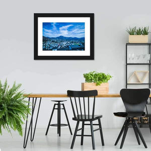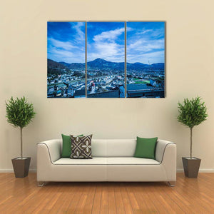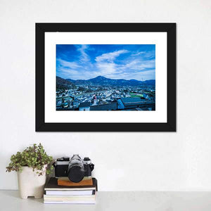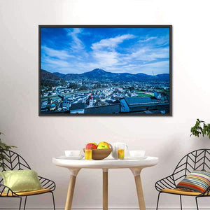 City Of Salzburg Canvas Wall Art shows a high-angle view of Salzburg’s cityscape with numerous buildings, partially snow-capped mountains, and a blue sky with white clouds. The image feels expansive, bright, and serene, and it pairs naturally with modern room decor.