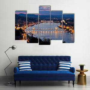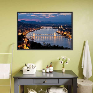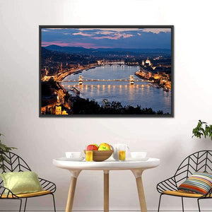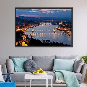This canvas wall art captures the serene beauty of Budapest's skyline, featuring a stunning view of its iconic bridges and the parliament building. The atmospheric night scene is alive with reflections on the river and a palette of blue, orange, and purple hues.