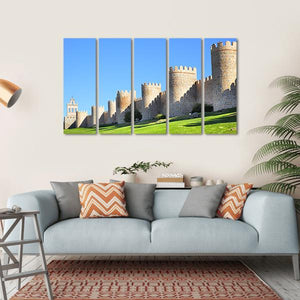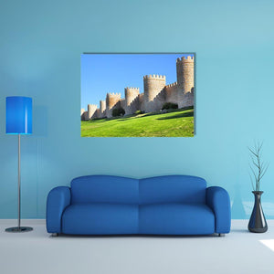 This canvas art captures the historic skyline of Avila, featuring majestic castle walls and towers against a vibrant blue sky. The blend of green hills and tan stone details invites a sunny atmosphere, making it a striking addition to your wall décor.