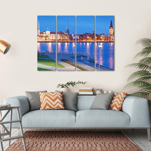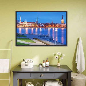 This canvas art beautifully captures a tranquil evening along the Daugava River, showcasing a vibrant city skyline. The photorealistic design features reflections on the water, spires of buildings, and lush park pathways, making it an eye-catching addition to any wall.