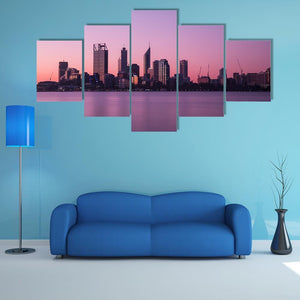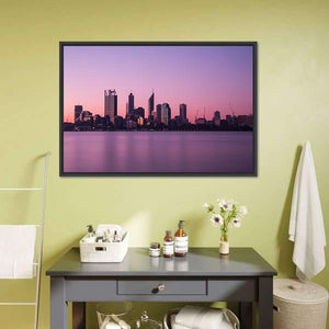 Cityscape In Perth shows a tranquil dusk skyline along the waterfront, with buildings and soft reflections on calm water. Muted purples, pinks and blues give it a modern, minimalist feel that works well in contemporary living rooms or bedrooms.