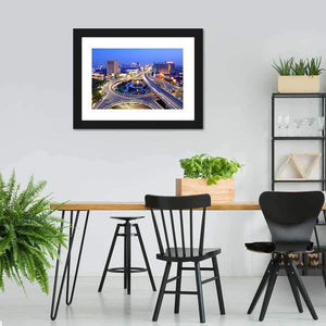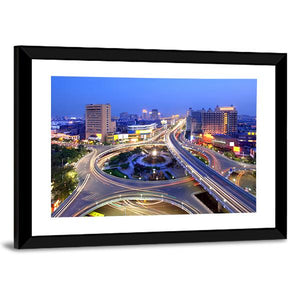 This canvas wall art captures the dynamic skyline and intricate highway interchange of Nanchang, highlighted by vibrant light trails. The modern, abstract style uses a bold palette of blue, yellow, and orange, bringing an energetic urban feel to any space.