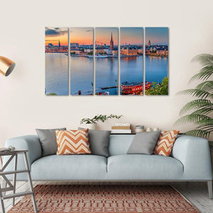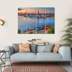 This canvas art beautifully captures the tranquil city skyline of Stockholm at dusk, featuring historic buildings and boats along the waterfront. Its serene palette of blue, orange, and yellow adds a scenic touch to your space.