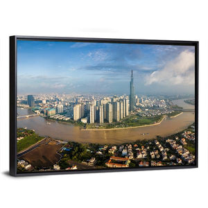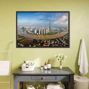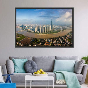 Skyline Of Ho Chi Minh Canvas Wall Art shows an aerial, wide-angle cityscape with a very tall, slender skyscraper at the center, rivers and boats below, and clouds above. The photorealistic, modern palette of blue, brown, white, green and gray gives an urban, bustling, expansive feel. It fits modern room decor and works well as wall art in contemporary home spaces.