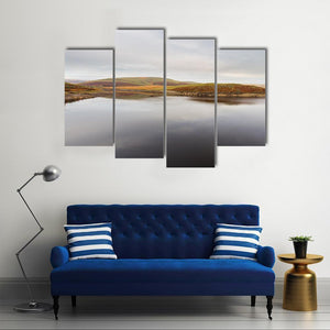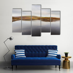 This serene landscape captures rolling hills, a tranquil lake, and an overcast sky. Its calming palette of greens, browns, and grays brings a peaceful vibe to any space.