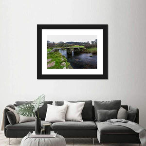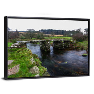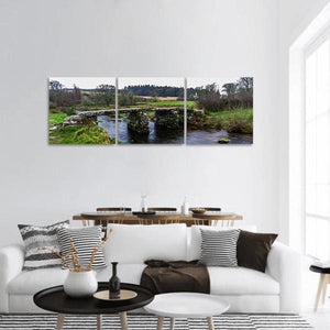 Postbridge, England captured on a panoramic canvas: a rough‑hewn stone bridge arches over a flowing river with lush green banks and a wooded backdrop. The scene reads serene and rustic, with muted greens, browns and gray‑blue tones that feel natural and calm. Suited to rustic, country-inspired rooms or casual modern spaces seeking a peaceful landscape accent.