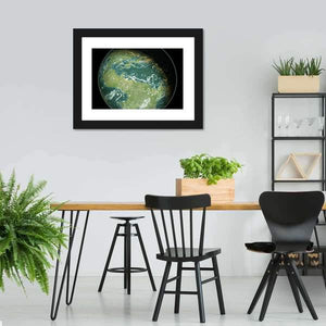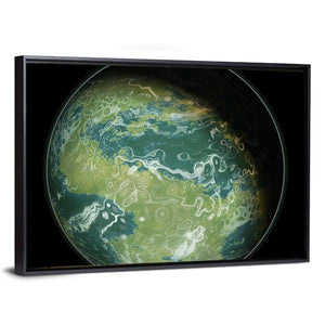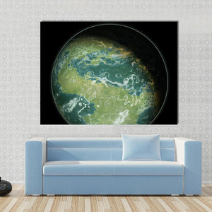 This canvas art features a close-up of an alien planet, showcasing distinct landmasses and swirling cloud formations. With its green and blue hues, it creates a mysterious and awe-inspiring atmosphere that enhances any room's decor.