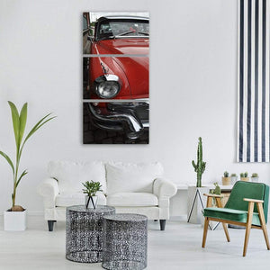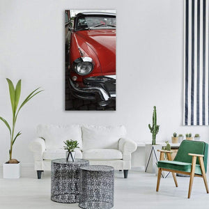 A close-up study of a red vintage car, focusing on the shiny chrome grille and round headlight to evoke a nostalgic, classic mood. This print suits retro or automotive-themed spaces and provides a bold, vintage focal point for a room.