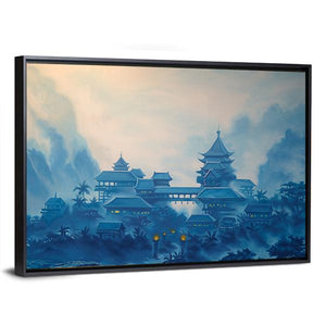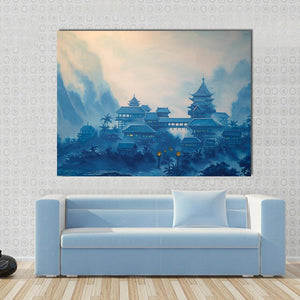 This canvas art features a serene Chinese landscape, showcasing a temple complex nestled among misty mountains. With a soft palette of blue, white, and green, it creates an ethereal atmosphere, perfect for adding a touch of mystery to your décor.