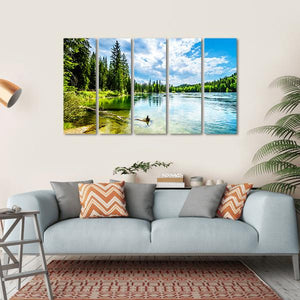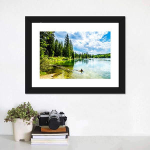 This canvas art captures a serene lake scene, highlighting the beauty of clear water and sunlight filtering through trees. It brings a vibrant touch of nature indoors, featuring a peaceful blend of green, blue, and earthy tones.