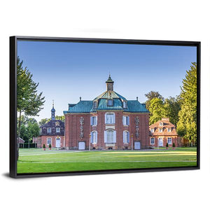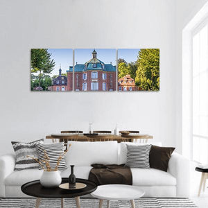 Clemenswerth Palace Sogel Panoramic Canvas Wall Art presents a symmetrical, panoramic view of a brick palace with a green roof, flanked by tall trees beneath a clear blue sky. Rendered in a realistic, traditional style, the scene feels serene, majestic, and historic, making it a calm focal piece for classic or modern interiors like living rooms or studies.