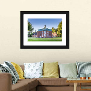 This realistic canvas art features the majestic Clemenswerth Palace, capturing the serene beauty of its red brick façade and green roof, surrounded by lush trees and a bright blue sky. Ideal for adding a touch of elegance to any room.