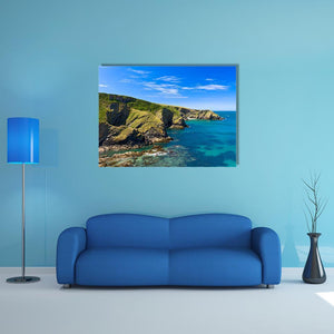 This canvas wall art captures the serene beauty of the Cornwall coast, featuring stunning coastal cliffs, a vibrant ocean, and a bright sky. Perfect for adding a touch of nature to your space.