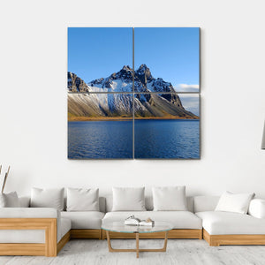 This artwork captures a serene landscape featuring jagged cliffs beside a calm lake, evoking a sense of tranquility. The vibrant blues and whites reflect the pristine beauty of nature, making it a fitting addition to any room decor.