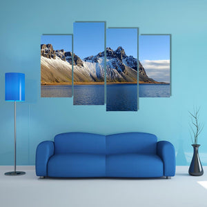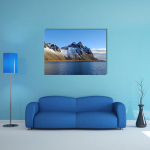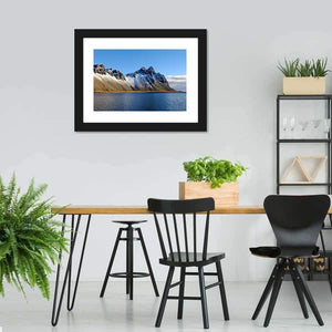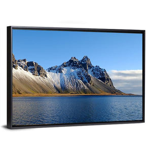 Cliff Beside Lake Canvas presents a lakeside cliff with snow-capped mountains rising beyond and a calm water surface. Sunlit snow on the peaks and a blue-and-white palette create a serene, majestic mood that fits modern home decor and room settings.