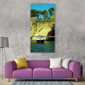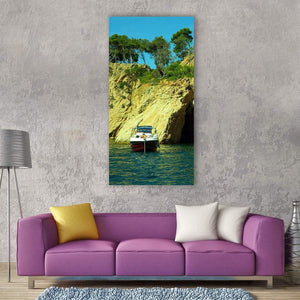 A realistic landscape print showing an anchored boat on a beach beside a cliff with a cave entrance and trees along the edge. Soft blues, greens and warm browns create a serene, peaceful daytime atmosphere that suits coastal and modern living spaces.