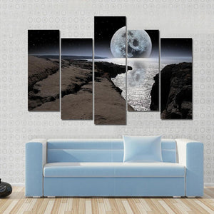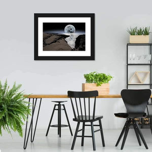 This stunning canvas art captures a serene coastline under a full moon, reflecting tranquil blues and grays. The night sky, dotted with stars, creates a majestic scene that invites calmness into your space.