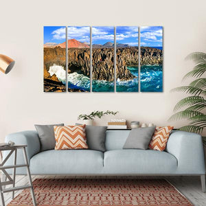 This canvas art captures the dramatic cliffs of Lanzarote Island, showcasing powerful ocean waves crashing against a rocky coastline. With vibrant colors of blue, green, and brown, it adds a natural and invigorating touch to any space.