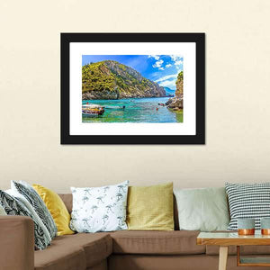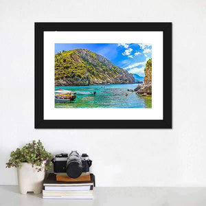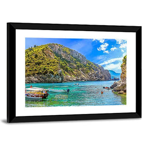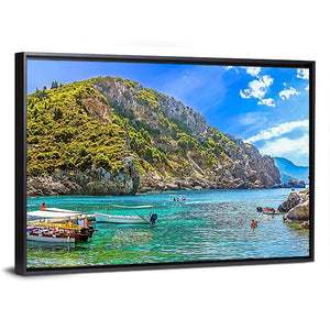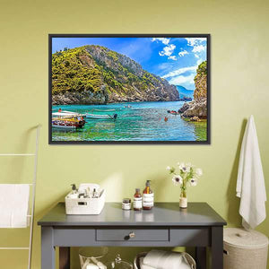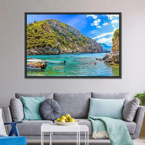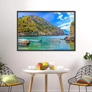This canvas artwork features a peaceful scene of boats anchored off a tropical island, surrounded by serene blue and green waters. The realistic depiction captures the essence of summer vacations and the beauty of Greece.