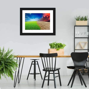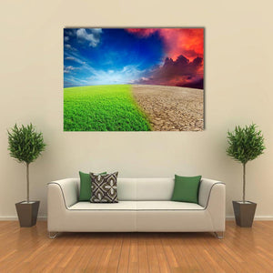 This powerful canvas art illustrates the stark contrast between a lush green field and dry, cracked earth, portraying the impact of climate change. The split scene captures an intense sky filled with storm clouds, offering a vivid reminder of our planet's condition.