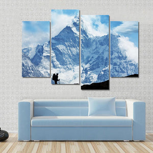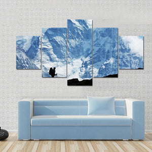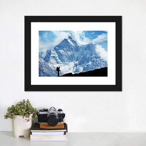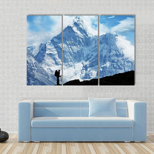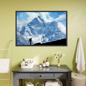 This captivating canvas art features a lone hiker silhouetted against majestic snow-covered mountains. The serene blue and gray palette evokes a sense of adventure in nature, making it a stunning addition to any wall.