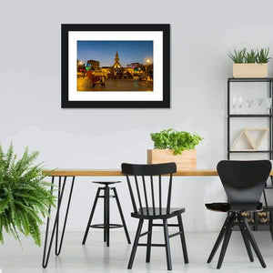Clock Tower Gate At Night Canvas Wall Art shows a lively, illuminated town square centered on a historic clock tower and spire, with lighted buildings, street vendors and people gathering at dusk. Rendered realistically in blues, yellows and warm browns, the scene captures evening city lights and fits modern, urban interiors.