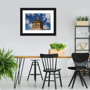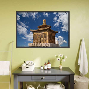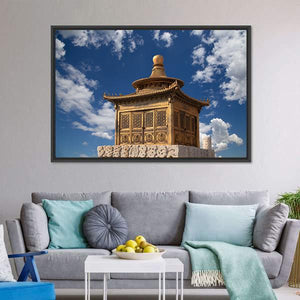 A low-angle view of a pagoda and temple set against blue and white clouds, with gold accents, ornate architectural details, and a textured stone base. The scene reads as serene and majestic and pairs well with modern or traditional room decor.