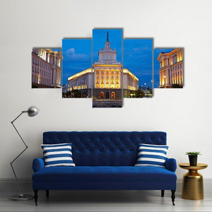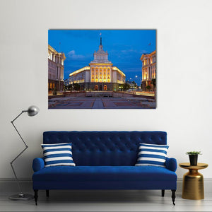 This canvas captures the majestic cityscape of Sofia, featuring a grand government building set against a twilight sky. Its symmetrical design and rich blue, yellow, and grey palette evoke illumination and elegance.