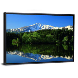 Green Mt Chokai Canvas Wall Art shows a snow-capped mountain and forest clearly reflected in a calm lake, rendered in a realistic landscape style. The scene reads as serene and majestic, with blue, white, green, and brown tones. It fits modern or nature-inspired rooms as a quiet focal piece.