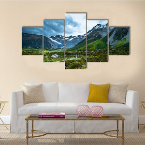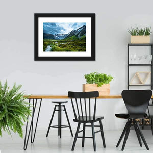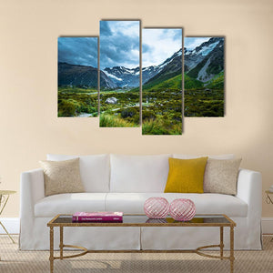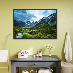 Mt Cook Canvas Wall Art depicts a wide mountain range with snow-capped peaks, a valley of grassy terrain and a winding path under a stormy sky. The image uses wide-angle composition and leading lines to create depth and a dramatic, serene, majestic mood. Suited to modern or nature-inspired rooms.