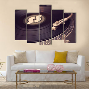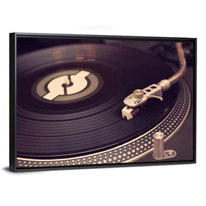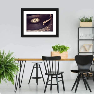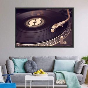 Close-up of a vintage record player and vinyl record in black, grey, white and silver tones. The image highlights the tonearm, stylus, and a stylized logo on the record, giving a classic, nostalgic mood that suits music-themed rooms and living spaces.