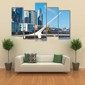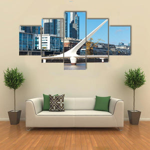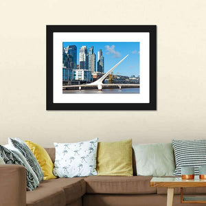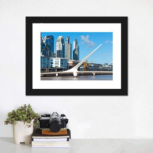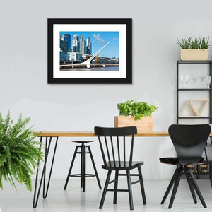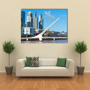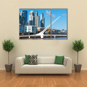 This vibrant canvas features a close-up view of Puerto Madero, showcasing a stunning white suspension bridge framed by striking skyscrapers and a serene river. Its modern and urban vibe makes it a bright addition to any space.