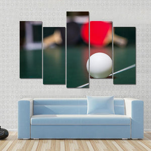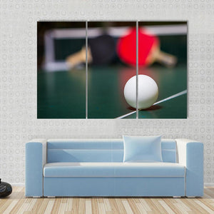 This canvas features a striking close-up of a white ping pong ball against a green table, capturing the essence of sport and focus. The blurry red and black paddles in the background create an atmosphere of anticipation, making it a perfect piece for sports enthusiasts.