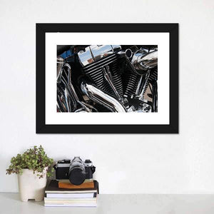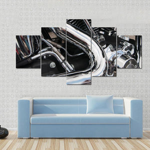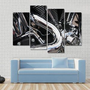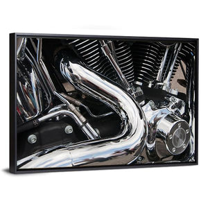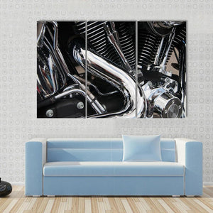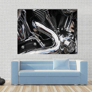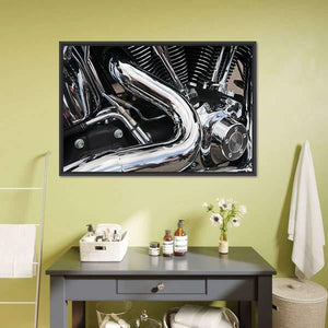 This close-up canvas art features a powerful motorcycle engine in a sleek palette of black, silver, and chrome. The intricate details, such as engine fins and a curved exhaust pipe, create an industrial vibe suitable for automotive enthusiasts.
