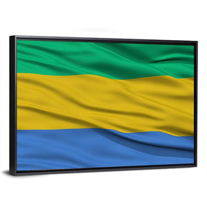 A waving Gabon flag captured in motion, with horizontal green, yellow, and blue stripes arranged by the rule of thirds for balanced movement. The modern canvas carries a proud, patriotic mood and works well in modern home interiors and room decor.