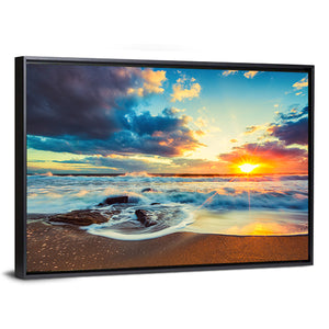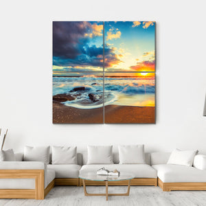 This canvas wall art captures a serene beach at sunset, where dramatic clouds loom over the ocean. The rich palette of blue, orange, and brown evokes a vibrant yet calm atmosphere, making it a wonderful addition to any nature-inspired décor.