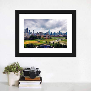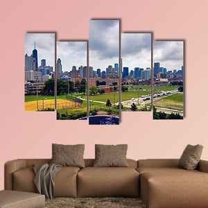 Cloudy Day In Chicago Canvas Wall Art captures a high-angle, panoramic view of Chicago’s skyline with a visible baseball diamond, tree-lined streets and cars beneath a cloudy sky. Rendered in a photorealistic style with blues, greens and grays, it offers an urban, expansive mood that suits modern living rooms or home offices.