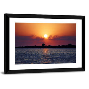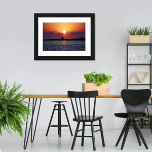 Cloudy Sunset On Lake Canvas Wall Art shows a peaceful sunset over a calm lake, with the sun peeking through clouds and a soft reflection on the water. Photographic and realistic in style, the warm oranges and cool purples create a serene, peaceful mood that fits modern home decor.