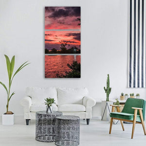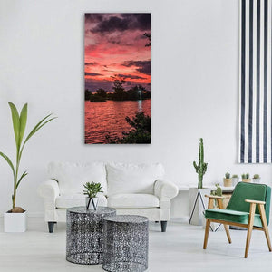 A seascape of water, sky, trees and a cloudy sunset that balances dramatic dark clouds with warm red‑orange light reflecting on the sea. The split composition and rule of thirds give the scene a vibrant yet serene feel, suited to modern room decor.