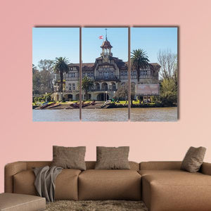 Boat Club In Argentina Canvas Wall Art shows a realistic riverside scene from Argentina, with a towered building, palm trees, and boats on the water. Muted blues, browns, greens, and whites create a serene, historic mood that fits well in living rooms and other home spaces seeking calm architectural interest.