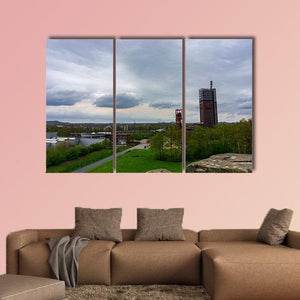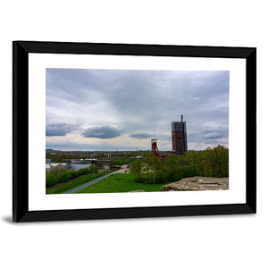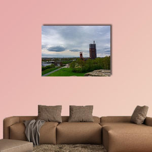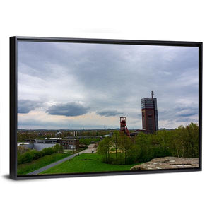 Coal Mine In Gelsenkirchen Canvas Wall Art depicts an industrial landscape with a tall mining tower, red lattice structure, trees and a calm river beneath a cloudy sky. The overcast, slightly desolate mood and green, brown, grey and blue palette work well with modern or industrial interiors.